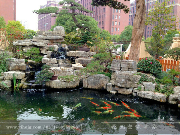 假山疊石,浮萍、水草、金魚渾然一體。
